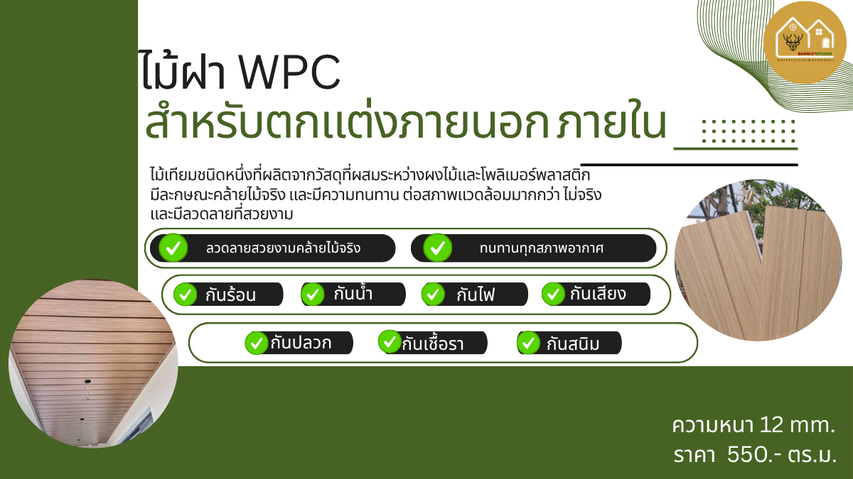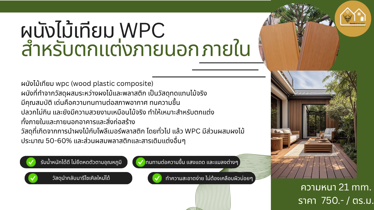 สำหรับตกแต่งภายนอกและภายใน มีความทนทาน ต่อสภาพแวดล้อมมากกว่า ไม้จริง และมีลวดลายที่สวยงาม